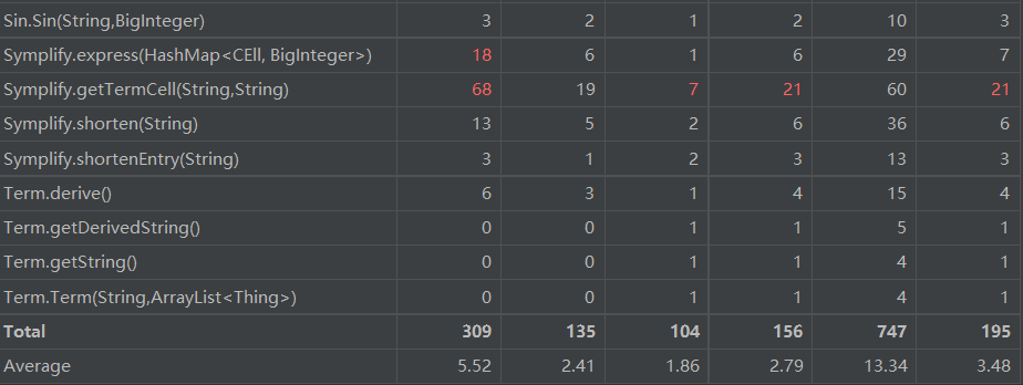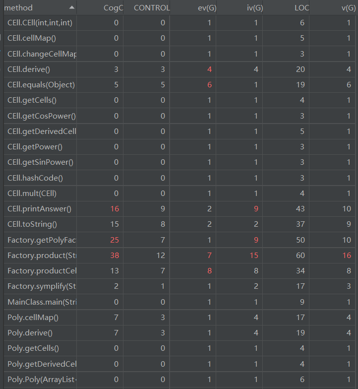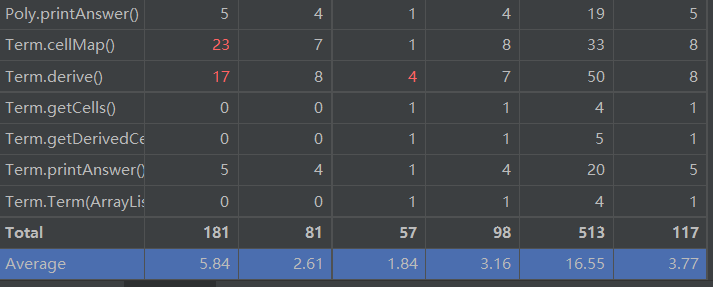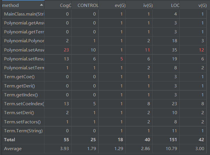 - 分析:由于第一次作业难度较低,可以看到超出复杂度及代码规模正常范围的类及方法并不多,“红点”具体集中在Polynomial这一类当中。在这一类的求导过程中,采用的方法出现复杂度过高的现象。观察代码可知,复杂度偏高的一部分原因是这一类的求导方法和得出结果的方法存在一定的耦合性,不够内聚。在代码的耦合这一点上,直到后两次作业也没有好好改善,这个问题应该在后续单元中引起重视。