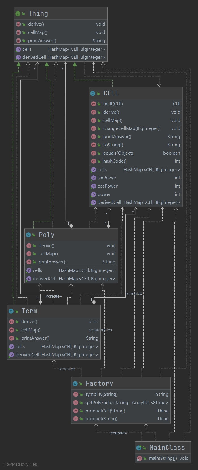 Thing:基本接口,本项目的表达式、项、三元组均实现了该接口。Thing最重要的方法:derive(),表达式、项、三元组均需实现对于该方法以及其他打印结果等方法的重写。