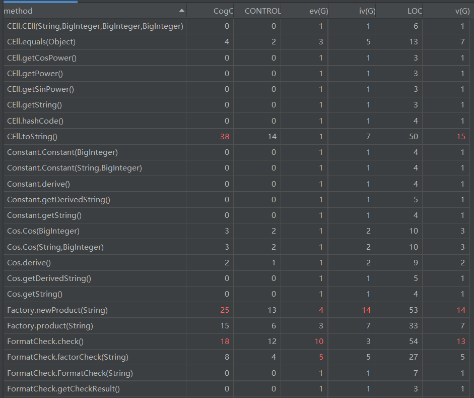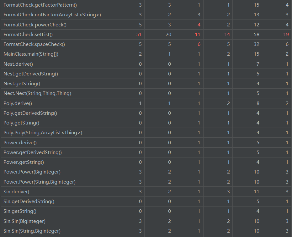- 分析:代码总行数达到800以上,代码规模控制得不好,一定程度上是由于耦合程度过大导致。在FormatCheck,Factory,Symplify类中均有类似的通过正则表达式对字符串进行处理的方法代码,程序内聚性差。在类的复杂度上,三个具有明显功能性的类:FormatCheck,Factory,Symplify的复杂度超出正常范围,说明了本人还不能很好地用面向对象的思想编写功能类,依然按照面向过程思想处理表达式求导问题。而各个层次单位:如表达式、项、因子的复杂度均控制得较好,这一点和第二次作业比有所进步(第二次作业的Term类的各个方法复杂度明显偏高)。