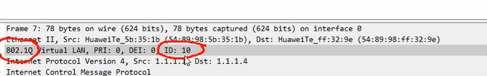 进行测试,对左边路由器的5好口进行数据抓包,此时PC1ping1.1.1.4,也就是右边路由器的一台PC,此时可以在抓包的数据中看到vlan标签和协议: