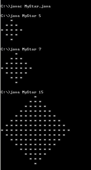 1 import java.util.Scanner; 2 3 public class lingxing { 4 public static void main(String[] args) { 5 Scanner scan= new Scanner(System.in); 6 int l= scan.nextInt(); 7 //菱形阵上半部分(包括中间行) 8 for(int i = 1;i <=(l+1)/2; i ++) 9 { 10 for(int j = (l+1)/2; j > i; j--) 11 { 12 System.out.print(" "); 13 } 14 for(int k = 1;k <=i*2-1; k++) 15 { 16 System.out.print("*"); 17 } 18 System.out.println(); 19 } 20 //菱形阵下半部分 21 for(int i = 1; i <=(l-1)/2; i++) 22 { 23 for(int j = 1;j <= i; j++) { 24 System.out.print(" "); 25 } 26 for(int k = 1; k <=l-i*2 ; k++) { 27 System.out.print("*"); 28 } 29 System.out.println(); 30 } 31 } 32 }