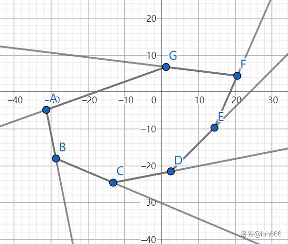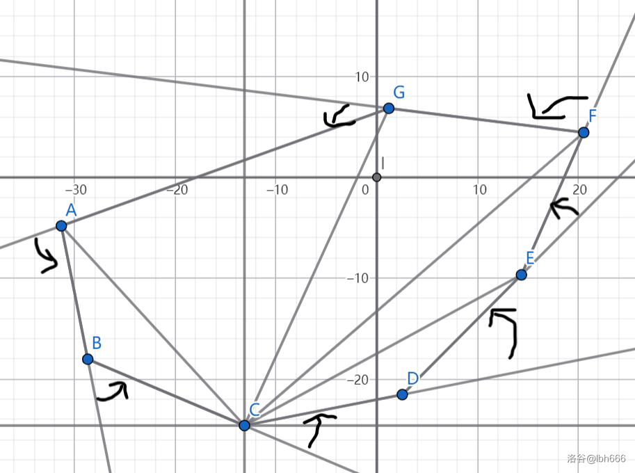 - 观察上图不难发现,其实要想在凸包上是延长线不断向左旋转得到的结果(多边形外角和等于 \(360\) 度,正好转了一周)。