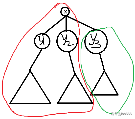 将总贡献拆成绿蓝两条路径。绿的路径贡献是 \((sum_x + cnt_x \times dis(x,y)) \times cnt_y\),蓝的路径贡献是 \(sum_y \times cnt_x\)。其中 \(dis(x,y) = dep_y -dep_x\)。于是树形 dp 做一下就好了。
