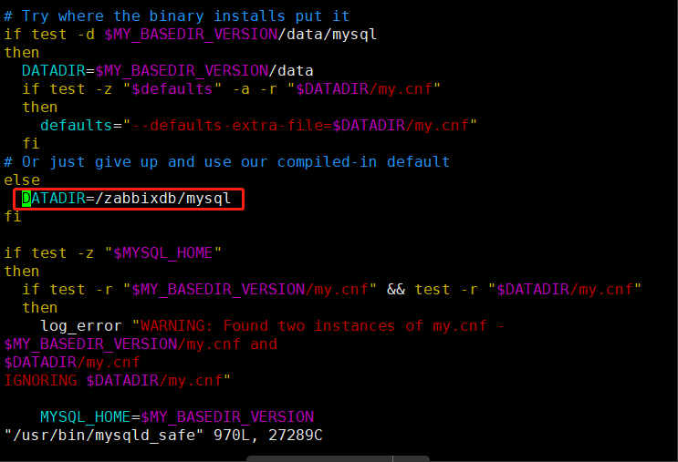 vim /usr/bin/mysqld_safe ----------关键 数据库启动时会检测脚本中的文件路径,此服务守护进程文件中有个变量需要修改 否则无法启动。