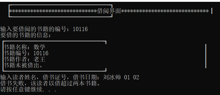 cout << "借书失败,该读者以借超过两本书籍。\n";