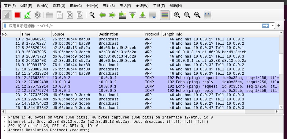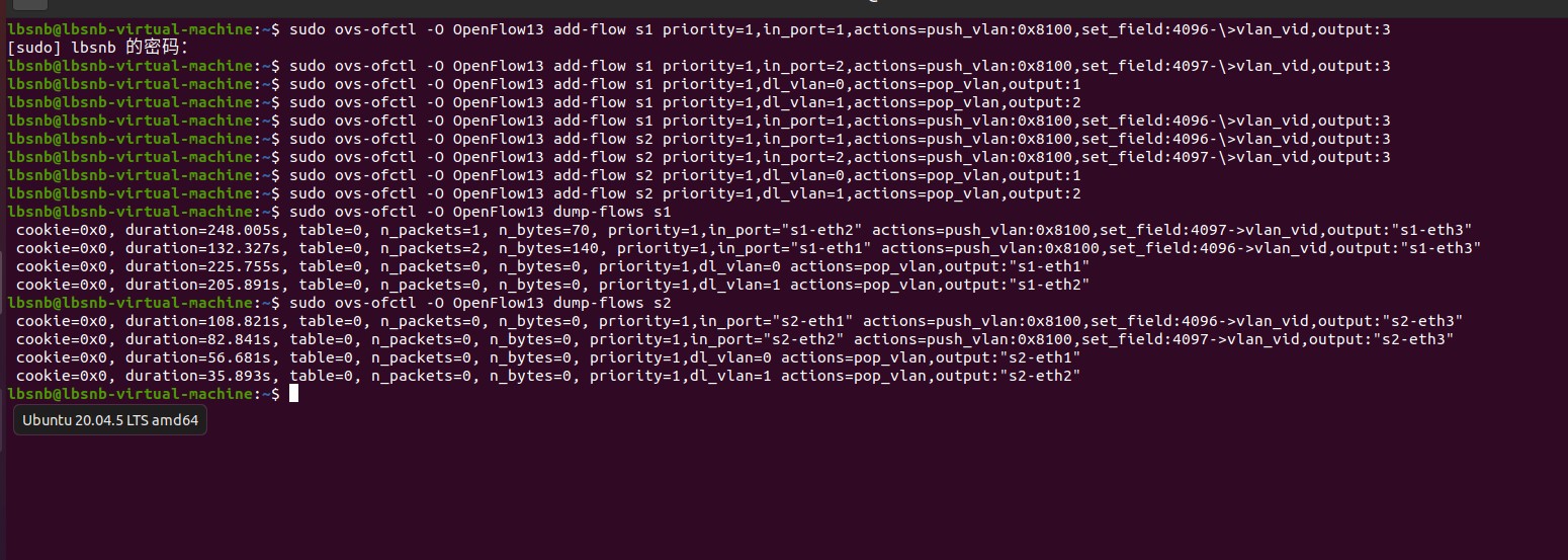 三.通过命令行终端输入“ovs-ofctl”命令,直接在s1和s2上添加流表,划分出所要求的VLAN。