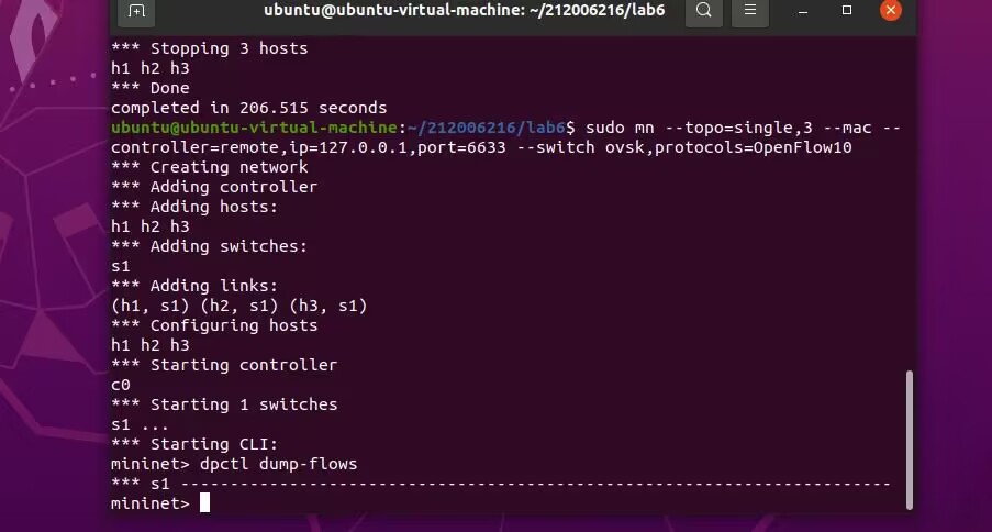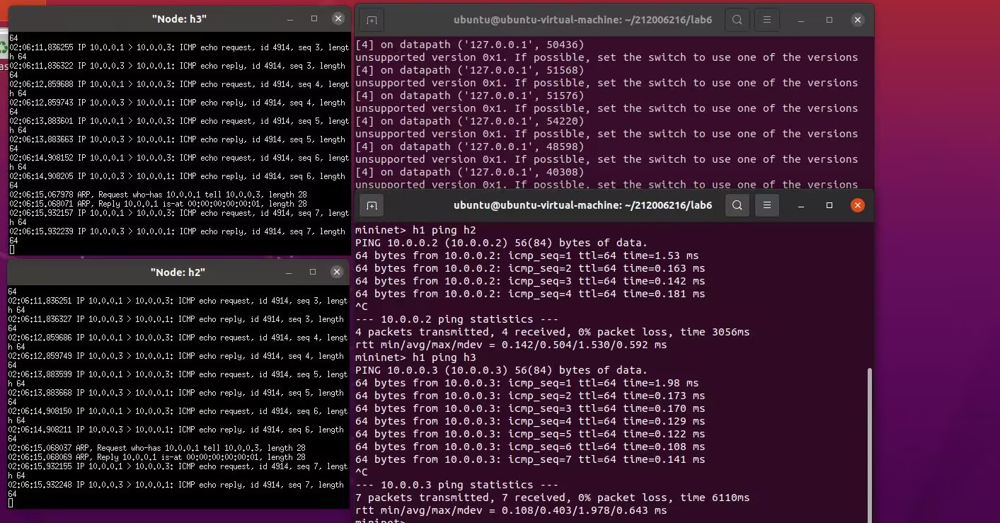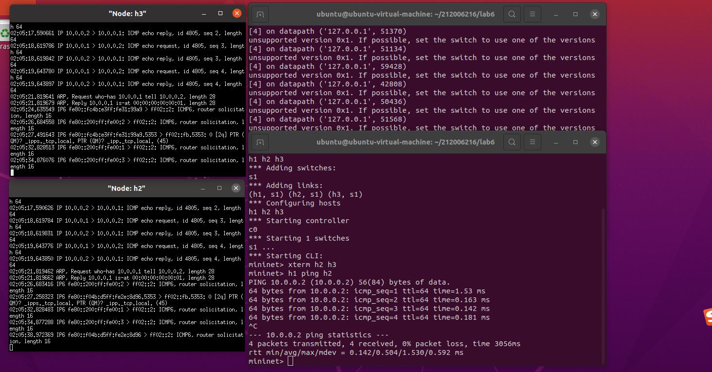 2.阅读Ryu文档的The First Application一节,运行当中的L2Switch,h1 ping h2或h3,在目标主机使用 tcpdump 验证L2Switch,分析L2Switch和POX的Hub模块有何不同。