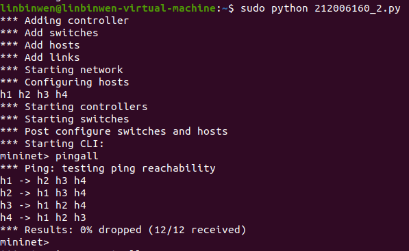 b) /home/用户名/学号/lab2/目录下开启Mininet CLI并执行pingall命令的截图、上述目录下查看OVS流表的命令结果截图,wireshark抓包截图,其余文字请勿赘述,否则扣分; - 进阶要求为选做,有完成的同学请提交代码和执行结果截图,有完成比未完成的上机分数更高。