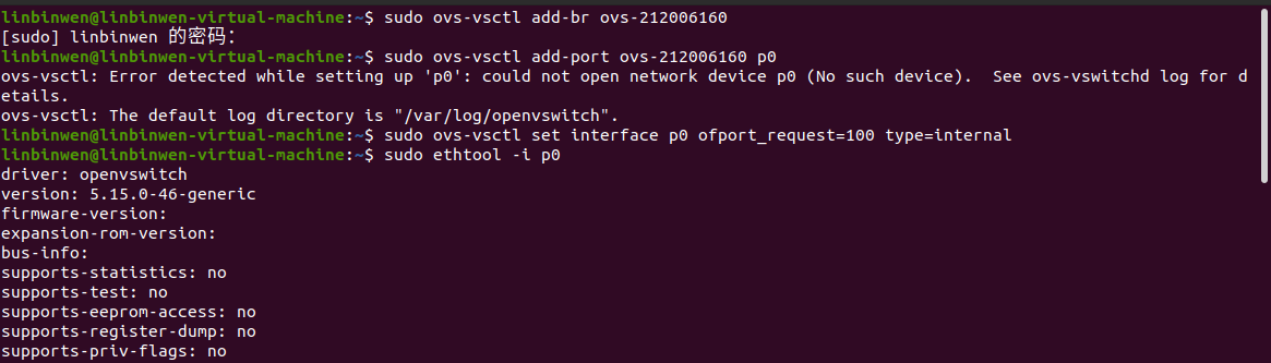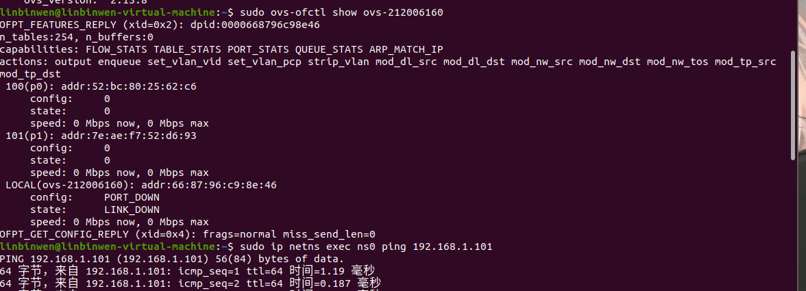 - ovs-vsctl基础操作实践:创建OVS交换机,以ovs-xxxxxxxxx命名,其中xxxxxxxxx为本人学号。在创建的交换机上增加端口p0和p1,设置p0的端口号为100,p1的端口号为101,类型均为internal;为了避免网络接口上的地址和本机已有网络地址冲突,需要创建虚拟网络空间(参考命令netns)ns0和ns1,分别将p0和p1移入,并分别配置p0和p1端口的ip地址为190.168.1.100、192.168.1.101,子网掩码为255.255.255.0;最后测试p0和p1的连通性。