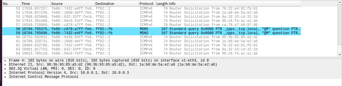 - 通过命令行终端输入“ovs-ofctl”命令,直接在s1和s2上添加流表,划分出所要求的VLAN。