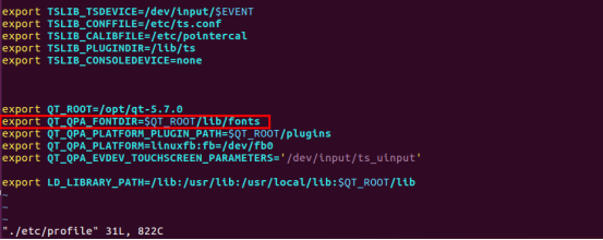 2、打开根文件系统的/etc/profile,添加字库的环境变量,注意这里字库的环境变量一定要写在QT库的路径下面