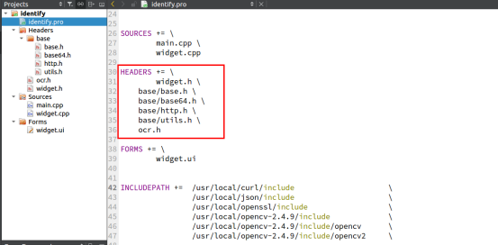 将百度AI的SDK拷贝到Ubuntu的qt工程下并解压,添加base、ocr,h到工程下