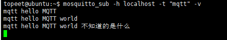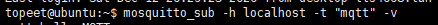 mosquitto_sub -h localhost -t "mqtt" -v // -h 指定要连接的MQTT服务器(IP),这里使用的是本机,也可以直接使用本机的IP // -t 订阅主题,此处为mqtt,所以主题为mqtt // -v 打印更多的调试信息