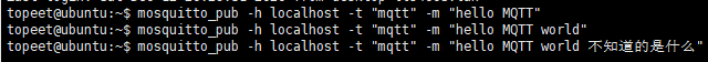 mosquitto_pub -h localhost -t "mqtt" -m "hello MQTT" // -h 指定要连接的MQTT服务器,这里连接的是本机,所以是localhost,也可以是要连接的设备的IP地址 // -t 订阅主题,此处为mqtt // -m 指定消息内容,这里发送的是Hello MQTT