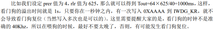 看门狗的溢出时间计算:Tout=(4*2^prer)*rlr/32 ms,prer:分频系数0-7,rlr:重装载值;