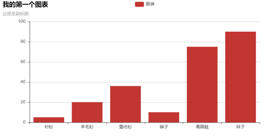 # -*- coding: utf-8 -*- from pyecharts import Bar ''' 柱形图 ''' bar = Bar("我的第一个图表", "这里是副标题") bar.add("服装", ["衬衫", "羊毛衫", "雪纺衫", "裤子", "高跟鞋", "袜子"], [5, 20, 36, 10, 75, 90]) bar.show_config() bar.render()