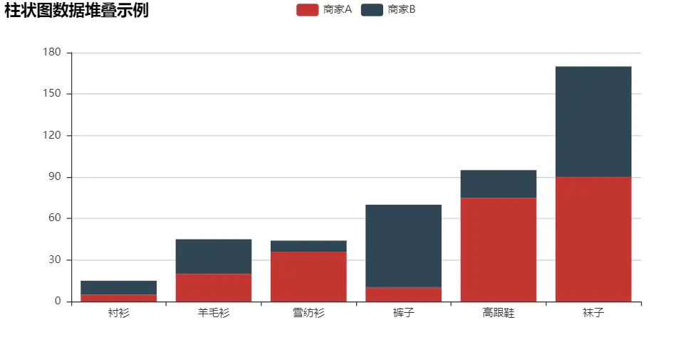 # -*- coding: utf-8 -*- from pyecharts import Bar ''' 柱状图数据堆叠 ''' attr = ["衬衫", "羊毛衫", "雪纺衫", "裤子", "高跟鞋", "袜子"] v1 = [5, 20, 36, 10, 75, 90] v2 = [10, 25, 8, 60, 20, 80] bar = Bar("柱状图数据堆叠示例") bar.add("商家A", attr, v1, is_stack=True) bar.add("商家B", attr, v2, is_stack=True) bar.show_config() bar.render()
