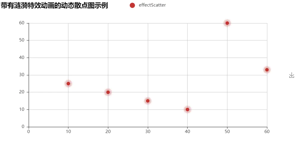 # -*- coding: utf-8 -*- from pyecharts import EffectScatter ''' 散点图 ''' v1 = [10, 20, 30, 40, 50, 60] v2 = [25, 20, 15, 10, 60, 33] es = EffectScatter("带有涟漪特效动画的动态散点图示例") es.add("effectScatter", v1, v2) es.render()