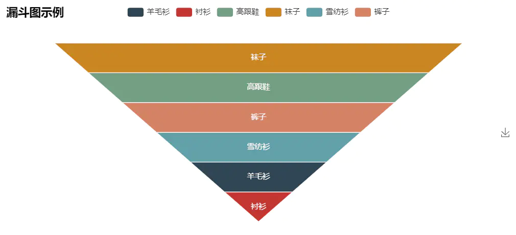 # -*- coding: utf-8 -*- from pyecharts import Funnel ''' 漏斗图 ''' attr = ["衬衫", "羊毛衫", "雪纺衫", "裤子", "高跟鞋", "袜子"] value = [20, 40, 60, 80, 100, 120] funnel = Funnel("漏斗图示例") funnel.add("商品", attr, value, is_label_show=True, label_pos="inside", label_text_color="#fff") funnel.render()