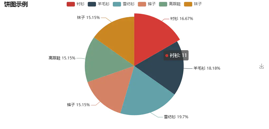# -*- coding: utf-8 -*- from pyecharts import Pie ''' 饼图 ''' attr = ["衬衫", "羊毛衫", "雪纺衫", "裤子", "高跟鞋", "袜子"] v1 = [11, 12, 13, 10, 10, 10] pie = Pie("饼图示例") pie.add("", attr, v1, is_label_show=True) pie.render()
