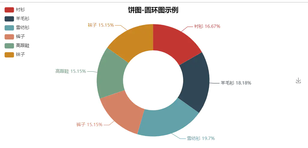 # -*- coding: utf-8 -*- from pyecharts import Pie ''' 圆环图 ''' attr = ["衬衫", "羊毛衫", "雪纺衫", "裤子", "高跟鞋", "袜子"] v1 = [11, 12, 13, 10, 10, 10] pie = Pie("饼图-圆环图示例", title_pos='center') pie.add("", attr, v1, radius=[40, 75], label_text_color=None, is_label_show=True, legend_orient='vertical', legend_pos='left') pie.render()