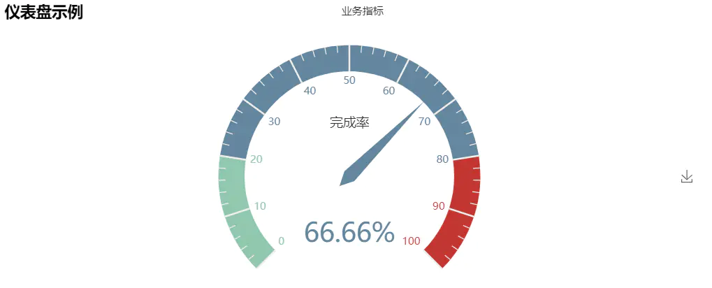 # -*- coding: utf-8 -*- from pyecharts import Gauge ''' 仪表盘 ''' gauge = Gauge("仪表盘示例") gauge.add("业务指标", "完成率", 66.66) gauge.show_config() gauge.render()
