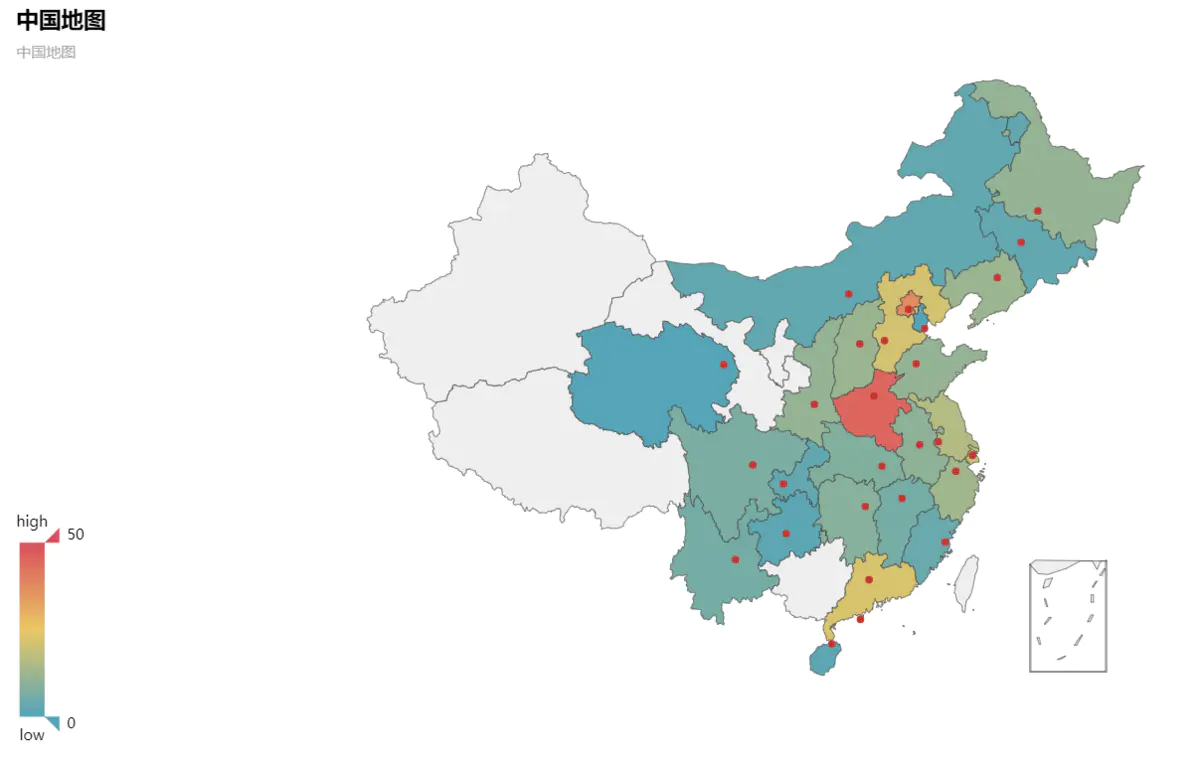1)中国地图# -*- coding: utf-8 -*- from pyecharts import Map, Geo ''' 中国地图 ''' # 省和直辖市 province_distribution = {'河南': 45.23, '北京': 37.56, '河北': 21, '辽宁': 12, '江西': 6, '上海': 20, '安徽': 10, '江苏': 16, '湖南': 9, '浙江': 13, '海南': 2, '广东': 22, '湖北': 8, '黑龙江': 11, '澳门': 1, '陕西': 11, '四川': 7, '内蒙古': 3, '重庆': 3, '云南': 6, '贵州': 2, '吉林': 3, '山西': 12, '山东': 11, '福建': 4, '青海': 1, '舵主科技,质量保证': 1, '天津': 1, '其他': 1} provice=list(province_distribution.keys()) values=list(province_distribution.values()) # maptype='china' 只显示全国直辖市和省级 # 数据只能是省名和直辖市的名称 map = Map("中国地图",'中国地图', width=1200, height=600) map.add("", provice, values, visual_range=[0, 50], maptype='china', is_visualmap=True, visual_text_color='#000') map.show_config() map.render(path="./data/04-01中国地图.html")