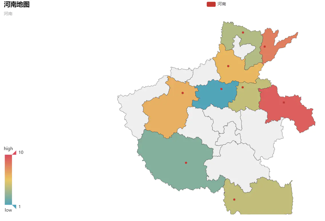 # -*- coding: utf-8 -*- from pyecharts import Map, Geo ''' 中国地图 ''' # 城市 -- 指定省的城市 xx市 city = ['郑州市', '安阳市', '洛阳市', '濮阳市', '南阳市', '开封市', '商丘市', '信阳市', '新乡市'] values2 = [1.07, 3.85, 6.38, 8.21, 2.53, 4.37, 9.38, 4.29, 6.1] # 河南地图 数据必须是省内放入城市名 map2 = Map("河南地图",'河南', width=1200, height=600) map2.add('河南', city, values2, visual_range=[1, 10], maptype='河南', is_visualmap=True, visual_text_color='#000') map2.show_config() map2.render(path="./data/04-02河南地图.html")