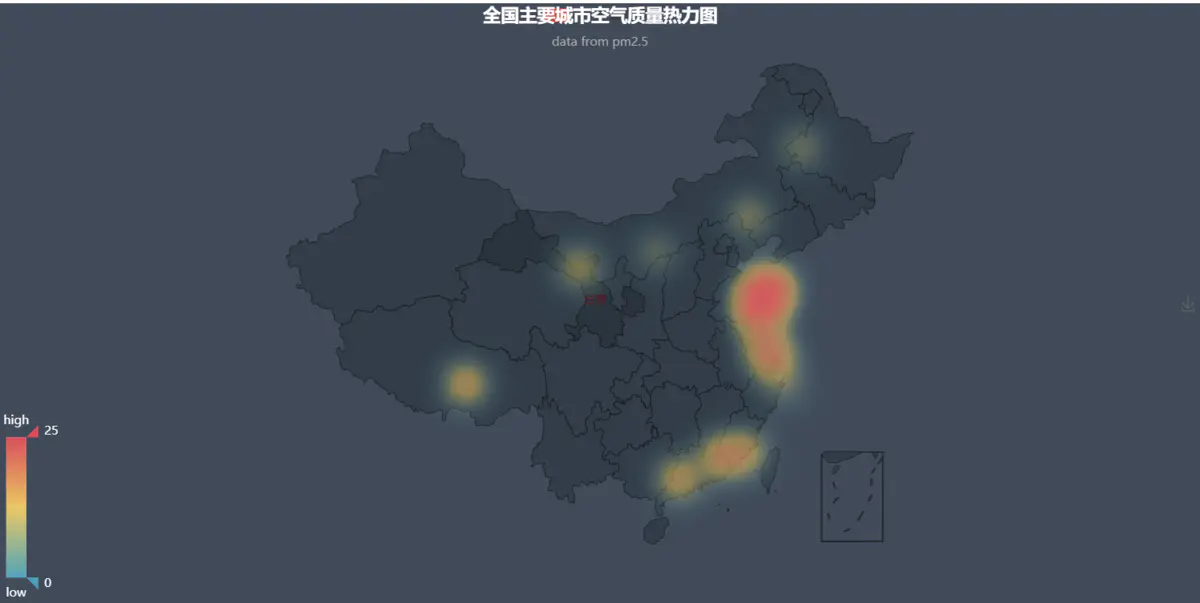 # -*- coding: utf-8 -*- from pyecharts import Map, Geo ''' 热力图 ''' data = [ ("海门", 9),("鄂尔多斯", 12),("招远", 12),("舟山", 12),("齐齐哈尔", 14),("盐城", 15), ("赤峰", 16),("青岛", 18),("乳山", 18),("金昌", 19),("泉州", 21),("莱西", 21), ("日照", 21),("胶南", 22),("南通", 23),("拉萨", 24),("云浮", 24),("梅州", 25)] geo = Geo("全国主要城市空气质量热力图", "data from pm2.5", title_color="#fff", title_pos="center", width=1200, height=600, background_color='#404a59') attr, value = geo.cast(data) geo.add("空气质量热力图", attr, value, visual_range=[0, 25], type='heatmap',visual_text_color="#fff", symbol_size=15, is_visualmap=True, is_roam=False) geo.show_config() geo.render(path="./data/04-04空气质量热力图.html")
