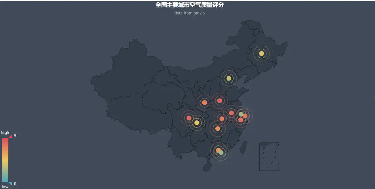 # -*- coding: utf-8 -*- from pyecharts import Map, Geo ''' 热力图 ''' # 空气质量评分 indexs = ['上海', '北京', '合肥', '哈尔滨', '广州', '成都', '无锡', '杭州', '武汉', '深圳', '西安', '郑州', '重庆', '长沙'] values = [4.07, 1.85, 4.38, 2.21, 3.53, 4.37, 1.38, 4.29, 4.1, 1.31, 3.92, 4.47, 2.40, 3.60] geo = Geo("全国主要城市空气质量评分", "data from pm2.5", title_color="#fff", title_pos="center", width=1200, height=600, background_color='#404a59') # type="effectScatter", is_random=True, effect_scale=5 使点具有发散性 geo.add("空气质量评分", indexs, values, type="effectScatter", is_random=True, effect_scale=5, visual_range=[0, 5],visual_text_color="#fff", symbol_size=15, is_visualmap=True, is_roam=False) geo.show_config() geo.render(path="./data/04-05空气质量评分.html")