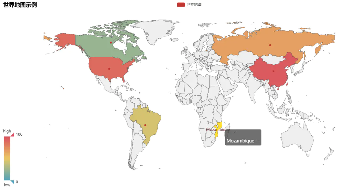 # -*- coding: utf-8 -*- from pyecharts import Map, Geo ''' 世界地图 ''' # 世界地图数据 value = [95.1, 23.2, 43.3, 66.4, 88.5] attr= ["China", "Canada", "Brazil", "Russia", "United States"] map0 = Map("世界地图示例", width=1200, height=600) map0.add("世界地图", attr, value, maptype="world", is_visualmap=True, visual_text_color='#000') map0.render(path="./data/04-00世界地图.html")