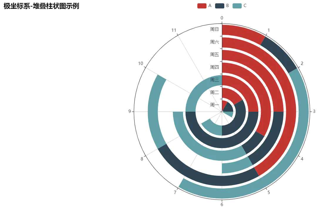 # -*- coding: utf-8 -*- from pyecharts import Polar ''' 极坐标图 ''' # 极坐标 radius =['周一', '周二', '周三', '周四', '周五', '周六', '周日'] polar =Polar("极坐标系-堆叠柱状图示例", width=1200, height=600) polar.add("A", [1, 2, 3, 4, 3, 5, 1], radius_data=radius, type='barRadius', is_stack=True) polar.add("B", [2, 4, 6, 1, 2, 3, 1], radius_data=radius, type='barRadius', is_stack=True) polar.add("C", [1, 2, 3, 4, 1, 2, 5], radius_data=radius, type='barRadius', is_stack=True) polar.show_config() polar.render(path='./data/03-04极坐标.html')