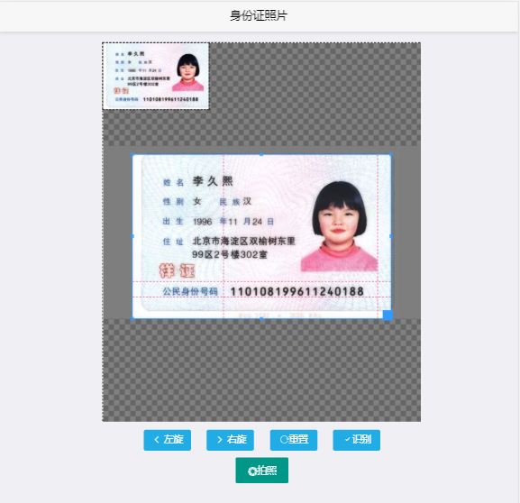 请求地址 http://localhost:8080/idCard/index 它基于 openCV 开源库。这意味着你可以获取全部源代码,并且移植到 opencv 支持的所有平台。它是基于 java 开发。它的识别率较高。图片清晰情况下,号码检测与识别准确率在90%以上。