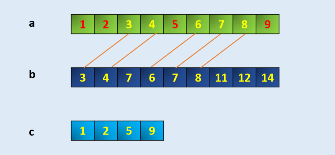 a = np.array([1, 2, 3, 4, 5, 6, 7, 8, 9]) b = np.array([3,4,7,6,7,8,11,12,14]) c = np.setdiff1d(a,b) carray([1, 2, 5, 9])
