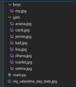 在目录下新建boys和girls两个文件夹,在对应的性别下放上自己的照片,另一边放上对应性别的照片,比如这样