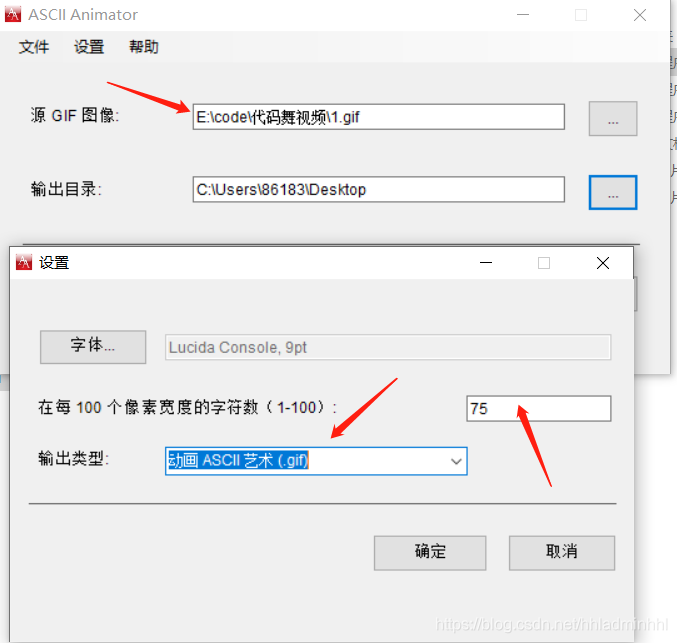 使用ASCII Animator将截取的GIF每一帧转换成ASCII。我们可以通过设置每100个像素宽度的字符数修改转换的字符密集程度。输出类型可以选择动画ASCII(.gif)