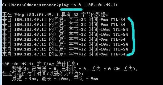 如果要不间断地返回数据包,那么就用ping -t来实现,这样就不断返回数据,直到管理员手动关闭,关闭的终止快捷键是Ctrl+C。