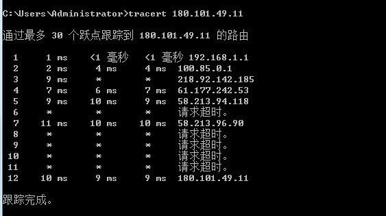 比如我们还是跟踪什么的IP地址,我们可以看到具体的跟踪路径地址。当网络反应慢的时候,返回的数值就是请求超时。通常10个节点左右跟踪完成的IP地址或者网站,访问速度都是较好的。