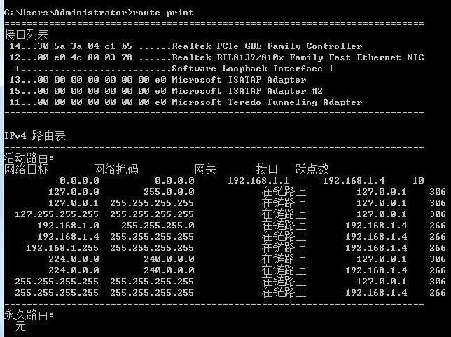 我们可以对本机的路由表查看和修改。查看路由表的命令为:route print