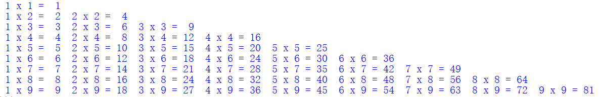 print('\n'.join([' '.join(["%2s x%2s = %2s"%(j,i,i*j) for j in range(1,i+1)]) for i in range(1,10)]))