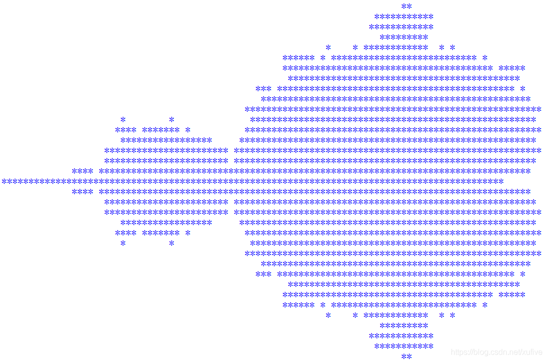 print('\n'.join([''.join(['*' if abs((lambda a:lambda z,c,n:a(a,z,c,n))(lambda s,z,c,n:z if n==0 else s(s,z*z+c,c,n-1))(0,0.02*x+0.05j*y,40))<2 else ' ' for x in range(-80,20)]) for y in range(-20,20)]))