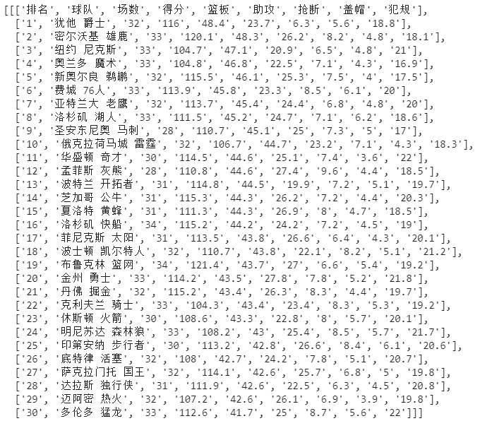 # 导入pdfplumber import pdfplumber # 读取pdf文件,保存为pdf实例 pdf = pdfplumber.open("E:\\nba.pdf") # 访问第二页 first_page = pdf.pages[1] # 自动读取表格信息,返回列表 table = first_page.extract_table() print(table)