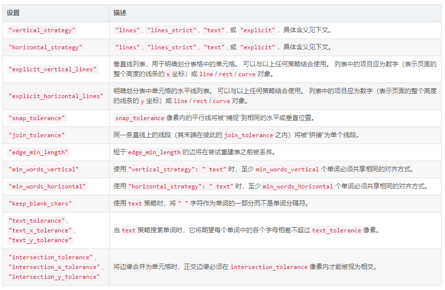 默认情况下,extract_table使用页面的垂直和水平线(或矩形边缘)作为单元格分隔符。该方法可以通过table_settings参数进行高度自定义。可能的设置及其默认值: