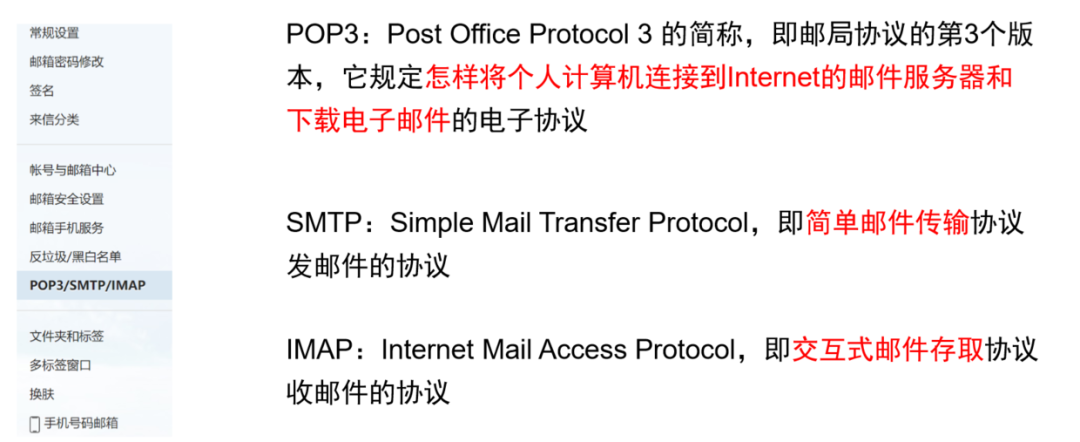 基础配置需要打开 POP3/SMTP/IMAP,针对不同邮箱有不同的操作