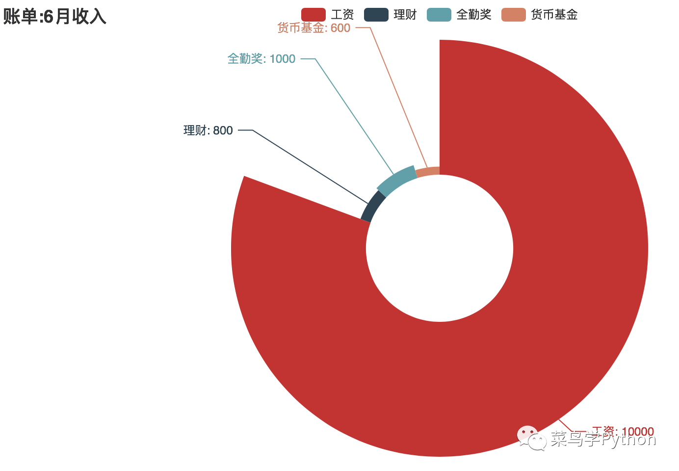 bill=''' 账单:6月 1.伙食费,-2000 2.零花钱,-500 3.房租,-3000 4.衣服,-1000 5.工资,+10000 6.理财,+800 7.朋友聚餐,-500 8.买衣服,-500 9.水电费,-100 10.油费,-300 11.全勤奖,+1000 12.货币基金,+600 13.手机费,-100 14.水果,-300 15.地铁+公交,-400 '''
