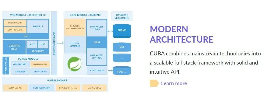 CUBA 平台是一个面向企业的开源(Apache 2.0)快速应用开发系统。它带有数十种工具作为 IDE、应用程序构建工作室、CLI 命令行界面和可靠的可扩展基础设施。CUBA 平台有一个丰富的插件系统,其中包含一个 BPM(业务流程管理)附加组件,需要花费一些时间来构建和安装。