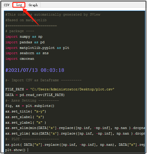 import numpy as np import pandas as pd import matplotlib.pyplot as plt import seaborn as sns import cmocean #2021/07/13 08:03:18 #- Import CSV as DataFrame ---------- FILE_PATH = 'C:/Users/Administrator/Desktop/plot.csv' DATA = pd.read_csv(FILE_PATH) #- Axes Setting ---------- fig, ax = plt.subplots() ax.set_title( "x-y") ax.set_xlabel( "x") ax.set_ylabel( "x" ) ax.set_xlim(min(DATA['x'].replace([np.inf, -np.inf], np.nan ).dropna() ) - abs( min(DATA['x'].replace([np.inf, -np.inf], np.nan ).dropna() )/10), max(DATA['x'].replace([np.inf, -np.inf], np.nan).dropna()) + abs(max(DATA['x'].replace([np.inf, -np.inf], np.nan).dropna())/10) ) ax.set_ylim( min(DATA['x'].replace([np.inf, -np.inf], np.nan ).dropna() ) - abs( min(DATA['x'].replace([np.inf, -np.inf], np.nan ).dropna() )/10), max(DATA['x'].replace([np.inf, -np.inf], np.nan).dropna()) + abs(max(DATA['x'].replace([np.inf, -np.inf], np.nan).dropna())/10) ) #- PLOT ------------------ ax.plot( DATA["x"].replace([np.inf, -np.inf], np.nan), DATA["x"].replace([np.inf, -np.inf], np.nan), linewidth = 3.0, alpha =1.0, color = "#005AFF" ) plt.show()