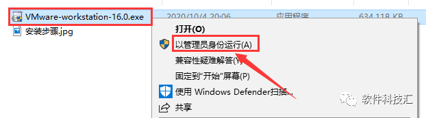 3.鼠标右击【VMware-workstation-16.0.exe】可执行文件,选择【以管理员身份运行】。