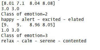 class_ar, class_va = self.predict_emotion(feature,fname) print(class_ar, class_va) if class_ar == 2.0 or class_va == 2.0: emotion_class = 5 if class_ar == 3.0 and class_va == 1.0: emotion_class = 1 elif class_ar == 3.0 and class_va == 3.0: emotion_class = 2 elif class_ar == 1.0 and class_va == 3.0: emotion_class = 3 elif class_ar == 1.0 and class_va == 1.0: emotion_class = 4