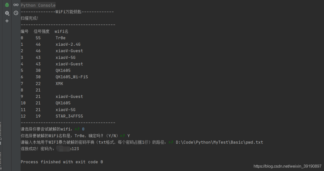 上述代码实现了依据信号强度枚举当前附近的所有 WIFI 名称,并且可供用户自主选择需要暴力破解的 WIFI,同时还可灵活指定暴力破解的字典,相对而言体验感提升了不少。进一步也可以将上述脚本打包生成 exe 文件,双击运行效果如下: